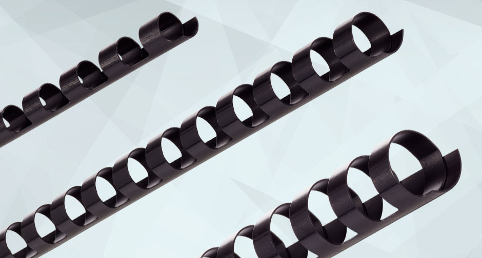 There’s a good chance you’ve heard of comb binding (or one of its other names: plastic binding or spiral comb binding). It’s one the most popular, simplest and economical binding methods available. Documents are punched, then bound together using a plastic spine with tabs that roll into itself. Comb binds also allow you to update documents, adding or removing pages as needed. They’re ideal for schools and businesses that create booklets for classes, meetings and training sessions.